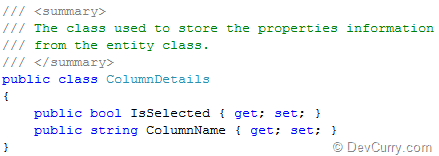 Step 2: In the MainPage.xaml.cs, add a class for storing MetaInfo of the Employee class. This class we will be used to read all public property names in the Employee class. This class will be further used for binding with the ListBox. The end user will select property name from this list box to hide column. The class code is as shown below: