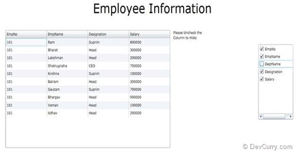 The above code is the heart of the article. When the user deselects any checkbox from the ListBox, the DataGridColumn having header matching the property name will be hidden. When the user checks the checkbox, the matching DataGridColumn again gets displayed.