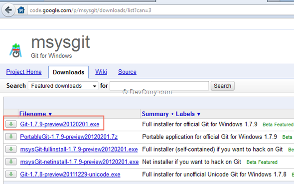 The above link takes us to code www.git-scm.com. The download link is on the right. Click on the Windows version to get to the following page. Download the highlighted exe and initiate the install.