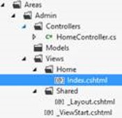Next we add a new View called Index in the Areas\Admin\View\Home folder, a _ViewStart.cshtml under the Areas\Admin\View\ folder and a _Layout.cshtml in the Areas\Admin\View\Shared folder.