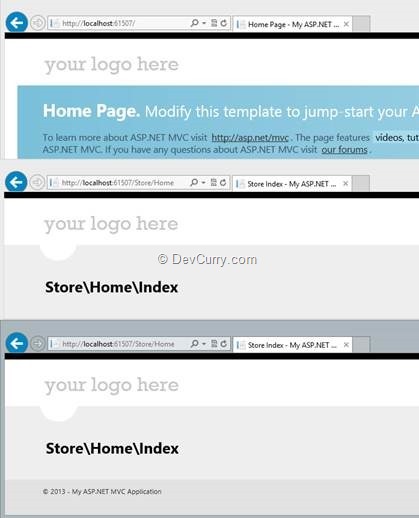 Now that we’ve added a new Area and things are working fine, how do we know if a second area will not cause routing conflicts? Well, as mentioned above, the AreaRegistrationContext internally passes the NameSpace to the Route Configuration. Thus multiple areas registered via the AreaRegistrationContext do not cause a problem. Just to make sure, add another Area called Store and add a HomeController to it (do not copy from Admin area or make partial classes between Admin and Store areas). You can copy the views over and update them appropriately.Run the application and navigate to all the three HomeControllers to see the pages separately.