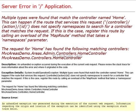 Don’t you just love the verbosity of the exception? Well in plain speak it means - if you are going to have two controllers called HomeController, you have to specify their namespace while registering the routes.