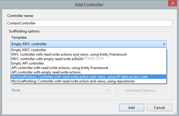Step 5: Now setup the Add Controller dialog as follows to generate CRUD screens for Contact model object.
